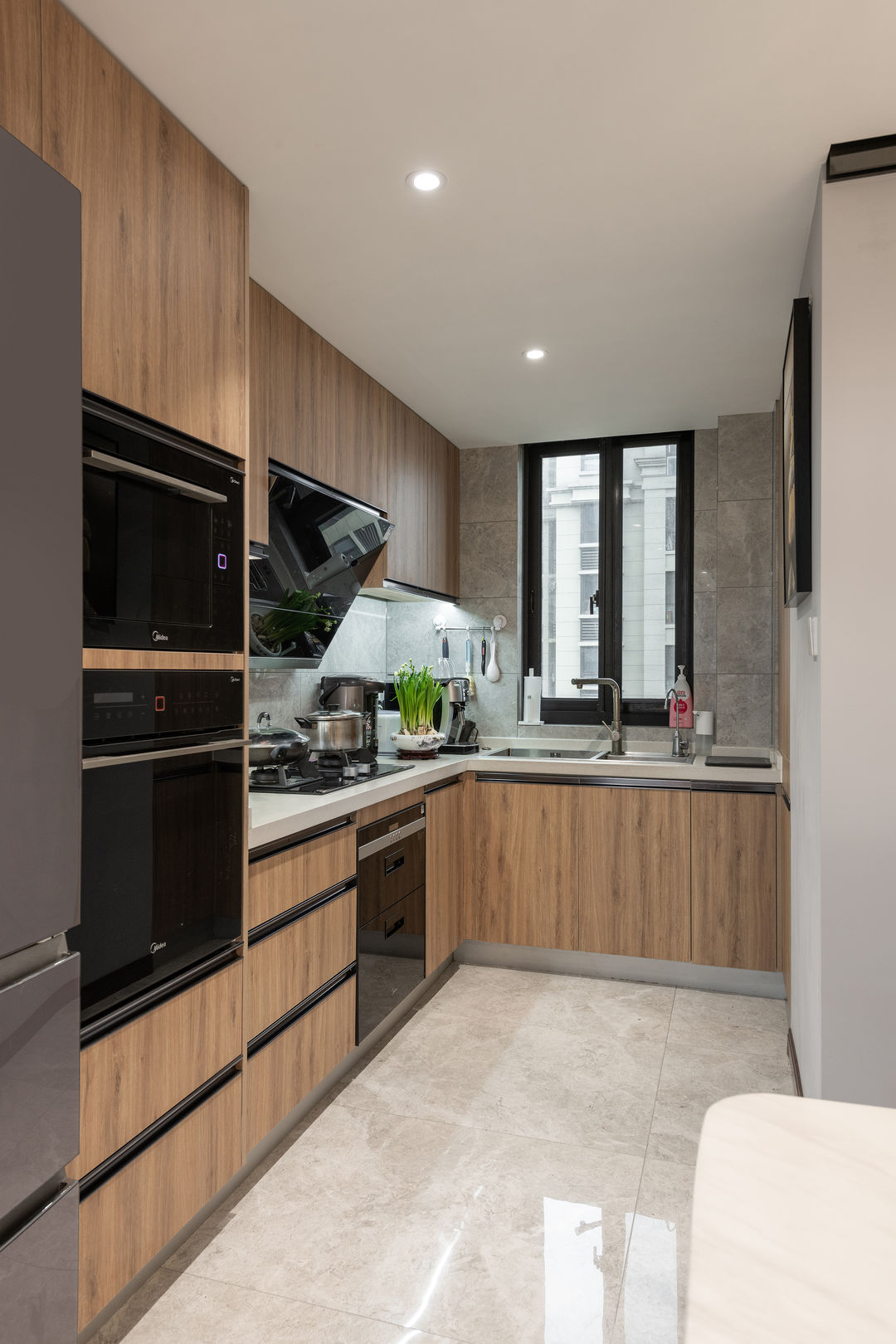平时老人在家煮饭,因此中厨设计在老人房这边,考虑到油烟和采光通透,做了L型窄边框吊轨移门,煮饭的时候关上,隔绝油烟也不影响空间通透效果。