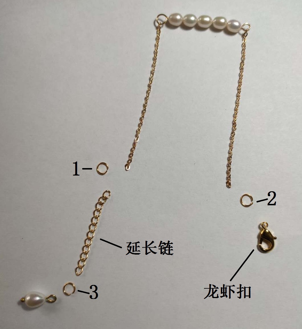 首先制作珍珠串部分,使用9针将几粒米形珍珠穿起来,并在结尾绕一个圈,两端的圈用于连接金属链。使用米形珍珠是因为这种珍珠的形状规整,表面质量较好无螺纹,性价比高。